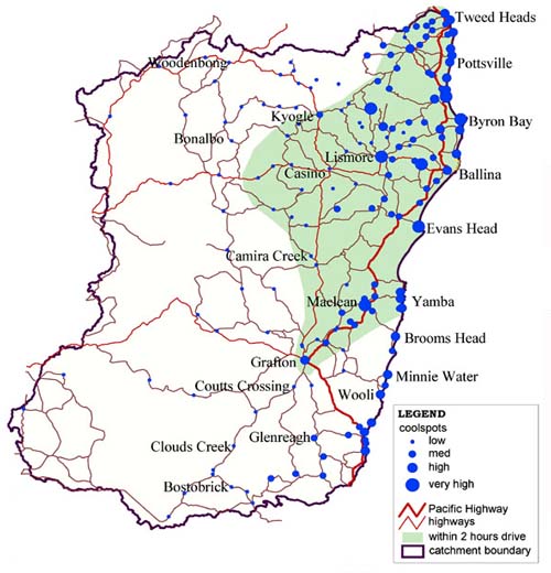 An envelope of a 2hrs drive from Byron by highway is shown as a guide.